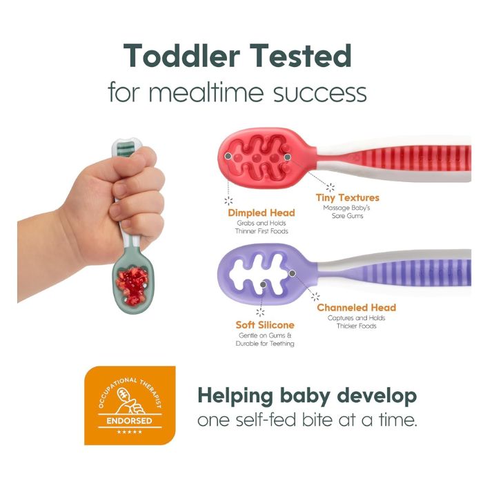 • Make the starting solids transition easier (and more fun!) for the baby. Each set comes with a pre-spoon perfect for purees, doubling as a teether for sore gums, along with an open-channel spoon designed to grip soft solids. These spoons help teach the skills and motions needed to graduate to a traditional spoon, without requiring wrist rotation to use – a skill children typically don’t develop until 2 years old.